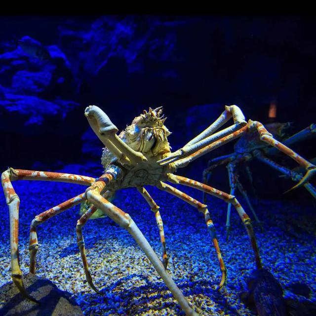 蜘蛛蟹科的巨螯蟹,又叫日本巨型蜘蛛蟹、甘氏巨螯蟹。它是蟹类中前螯最长的,也是现存最大的甲壳动物,因为长相酷似蜘蛛而得名。有的小朋友可能会问,它到底是蜘蛛,还是螃蟹呢?哈哈!巨螯蟹实际上是螃蟹哦。因为它是甲壳动物,身体被坚硬的外壳包着,靠鳃呼吸。而蜘蛛是蛛形纲动物,身体没有那层盔甲,靠呼吸器官书肺还有气管来呼吸。知道了这些特征,你就可以把它们区分开啦。